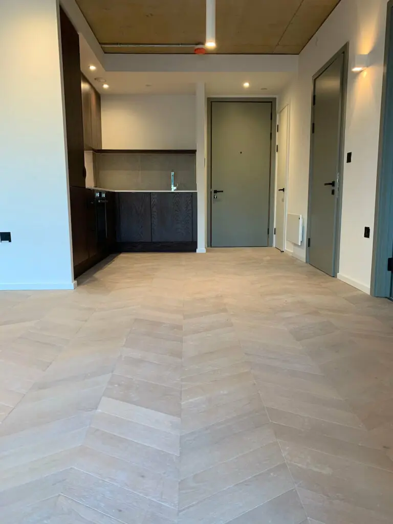 In total, nearly 1,000m² of herringbone was installed within the historic building, alongside phased chevron installation across the residential units. Maintaining pattern accuracy, tonal consistency and installation standards across both contexts required close coordination between architect, contractor and supplier.