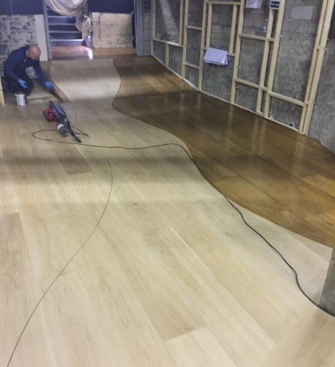 The image above shows a 260mm wide board being installed in the Viking Museum which is in York. The fitter is creating a “river” as a walkway between the exhibits.
